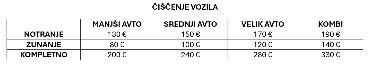 ZUNANJE STORITVE: • Temeljito ročno pranje vozila • Čiščenje platišč in pnevmatik • Čiščenje zunanjih stekel in detajlov • Natančno čiščenje rež, pragov in emblemov • Nanos zaščite za lepši sijaj in lažje vzdrževanje