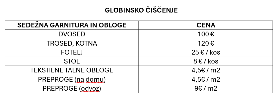 GLOBINSKE STORITVE: • Suho sesanje • Odstranjevanje madežev • Ekstrakcija umazanije • Parna dezinfekcija